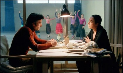 We move on to a huge dance studio, where dancers are lounging, talking, and trying out steps on each other. The camera pans across de Lucía and other musicians, who are jamming, and settles on Gades, who takes a reel of tape from a messenger, threads it into his tape recorder, and listens. “Pres des remparts de Seville,” Bizet’s waltz to be sung by Carmen, flutters on the air and then grows louder and louder as Saura zooms in on Gades’ face, watching him absorb the musical strains and try to visualize them in dance. This device of amplifying Bizet’s score will be used again to telegraph Gades’ state of mind and creative process.