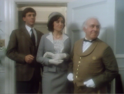 The production design and cinematography are particularly noteworthy for a television play. A gauzy glow inflects the flashbacks, but the present isn’t completely present. A warm sepia envelopes the modern hotel environs. Bernard complains about the old people in the sparsely populated tea room, seemingly unaware that he’s pushing 70 himself. Later, Bernard finds himself thrown back in time, hallucinating that the young people at the hotel for a dinner/dance of the type that was a nightly occurrence in his day are actually people from the ’30s. Some interesting camera angles frame Bernard and Jean as relics of the past; for example, in one scene, when Jean is returning to her room, a shadow of the Victorian ironwork in the hallway mixes with her shadow, as though she were a piece with it, as well as a prisoner of a bad choice made long ago.
