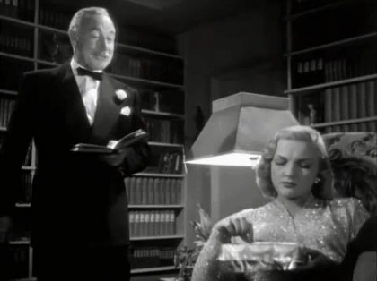 We start in noir country—a nightscape of a city street lined with bright theatre marquees. The camera moves down the street and swoops down to a close-up of a shop window advertising “Clara Calhoun: Your House of Beauty.” The door opens to Clara herself (Jane Randolph) ushering a happy patron with a new coif out with hopes that she gets home safely. The remark was meant to flatter the patron, but it has portends of a tragedy soon to befall the shop.