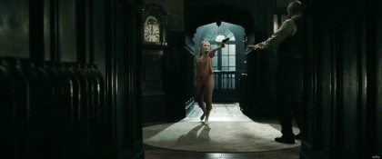 Soon after, the narrative seems to move into another reality, one that still follows the basic parameters—rather than a nominal flunky Blue is the impresario-pimp in a nightclub-brothel where he and his thugs keep the dancers as prisoners and concubines, and the asylum’s chief psychiatrist, Dr. Vera Gorski (Carla Gugino, wielding an amusingly cheesy Slavic accent), is the club’s choreographer. They stage garishly spectacular, erotic gyrations for the rich men who frequent the club. Snyder follows with a montage that cuts between Blue and Vera singing Roxy Music’s “Love is the Drug,” scenes from the other performances by the dancers, and vignettes depicting a tough guy entering the club, leaping in ecstasy in watching the performances, buying a roll with one of the girls, and then getting himself beaten up and hurled out after losing his cool in a poker match. The editing and camerawork in this sequence is worthy of Scorsese in one of the most electric bits of moviemaking I’ve seen in several years, a delirious sprawl of flying dollar bills, glasses being filled, huge make-up-plastered lips and eyes, and flashes of absurd dance routines in which Indian princesses, naughty nurses, and crucified angels excite the clientele.