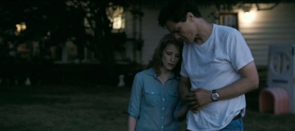 Nichols also makes the working-class milieu of this Ohio community real. The familial and friendly bonds, the fears and doubts, the suspicions of the community all ring true. The house Curtis and Samantha have is not the typically glossy, well-appointed home common in most films—the furnishings are well-worn, a bit tacky, and the entire home has a lived-in feel without seeming like a cliché. Curtis, Samantha, and Hannah are a likable, relatable family, and much credit goes to Chastain for giving another full-bodied performance, one of a woman whose warmth and fragile strength make us feel deeply for her and her family.
