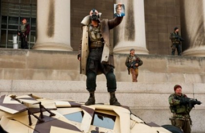Wayne and his admirable Crichton, Alfred (Michael Caine), swiftly track Selina down, but she proves to be not simply a free agent, but enmeshed in a conspiratorial vortex where rival businessman Daggett (Ben Mendelsohn) is trying to take over Wayne Enterprises and bankrupt it at the behest of hulking mercenary Bane (Tom Hardy). Bane was once, and may still be, linked to the League of Shadows, a terrorist organisation whose boss, Ra’s al-Ghul (Liam Neeson), trained Wayne and whom Wayne turned against in Batman Begins (2005). In one of the most ludicrous action sequences I’ve ever seen, Bane kidnaps scientist Pavel (Alon Moni Aboutboul) from a CIA rendition plane in mid-air by rappelling from another plane, and it was all to make it look like Pavel died in a crash. Bane then sets himself up in Gotham’s sewers to stage-manage the destruction of Wayne/Batman before subjecting Gotham to a punitive purge.