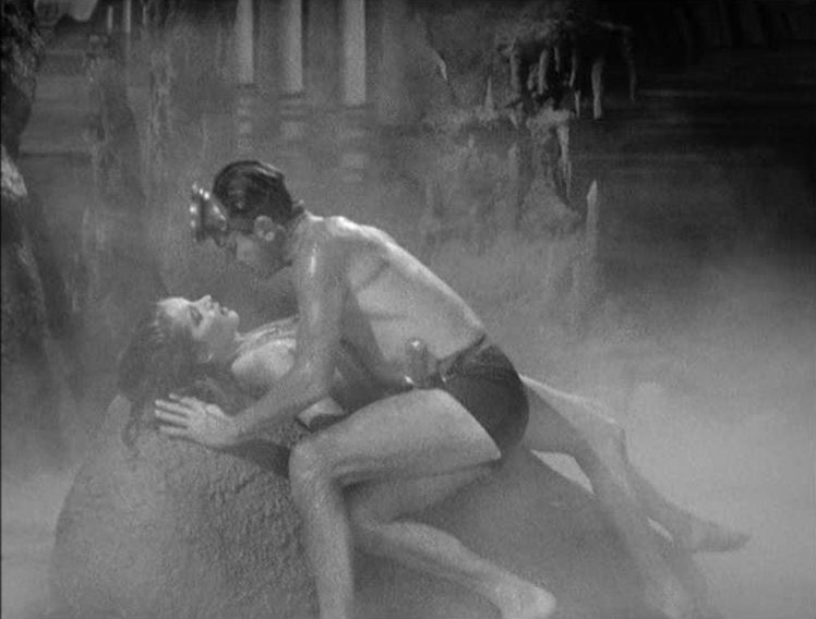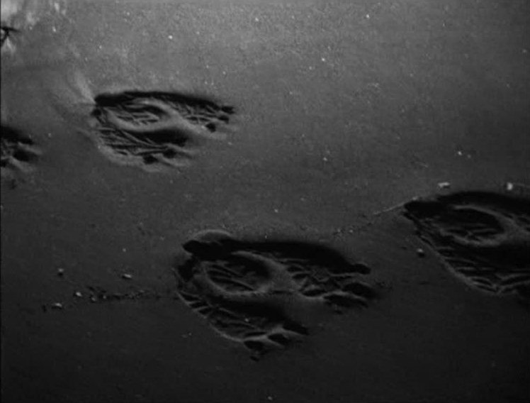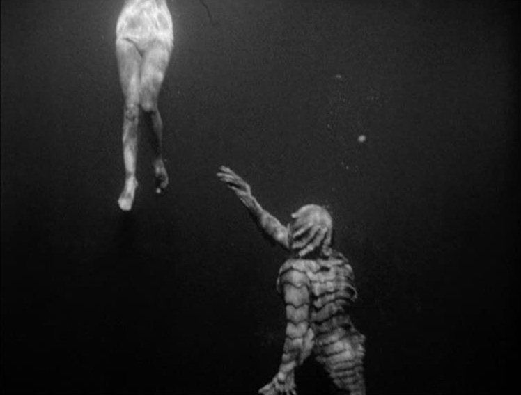 The strange humanity of the monstrous (and vice versa), a theme most obviously explored in the canonical Frankenstein and Wolf Man films, was in Creature grafted onto an explicitly evolutionary investigation of both humanity’s progress and limitations, unpeeling the notion that under the stellar-aimed mindset of modernity lurks the slavering, adapted beast for which the basic drives of sex and eating are the only true motives. These motifs are introduced in a prologue that strikes the same pedagogical stance that a lot of these films did, but with an underlying quality of curiosity and a faintly haunting note, as a chronicler narrates the birth of the Earth in fire and cataclysm, and then then emergence of life, seen as strange-looking footprints dotting a primeval beach. This promptly segues into an image of the past looming into the present with fearsome immediacy of the fossil hand.