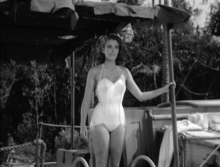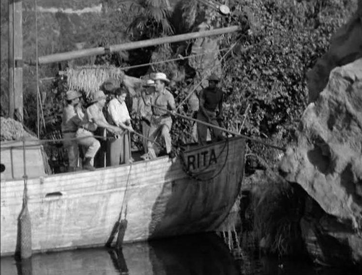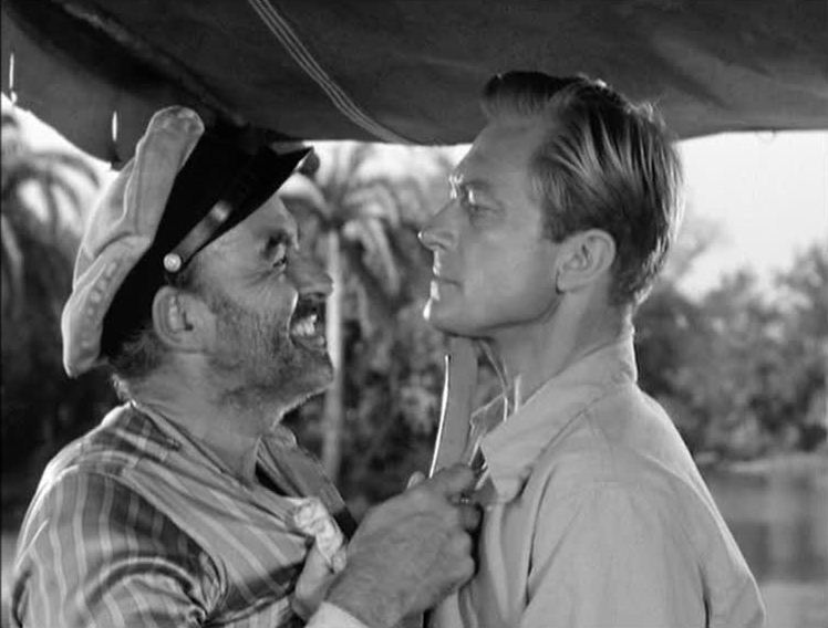 Primeval past and space age present soon come into jarring contact as Maia presents the fossil hand to the remarkably good-looking collective of American nerds running the Brazilian Instituto de Biologia Maritima. Maia gains the interest of guest field researchers David Reed (Richard Carlson) and Kay Lawrence (Julie Adams), and they, in turn, present the find to their boss Mark Williams (Richard Denning), a blonde he-man who’s always eager for anything that can bring glory and funding to the institute. Along with another of the institute’s brainiacs, Dr. Ed Thompson (Whit Bissell), they form an expedition to head to Maia’s dig site and extract the rest of the remains, hiring the steam launch Rita, captained by the shabby genial Capt. Lucas (Nestor Paiva) for the voyage upriver. Finding the mutilated bodies of the diggers, the scientists are momentarily shaken, but press on to find the rest of the skeleton. They have no luck because much of the rock face has been washed away by the river, and the fossil bones along with it. Deciding to take a chance on the theory that the eroded fragments might have collected downstream in the fabled Black Lagoon, the expedition packs up and moves into the recessed waterway, only to discover they’re not alone: the immensely powerful and devastatingly violent Gill Man proves to be the product of an evolutionary cul-de-sac that is nonetheless smart and aggressive enough to have survived into the twentieth century in this locale. Mark, hungry for glory and the thrill of battling something as relentless and motivated as he is, sets out to trap or kill the beast, browbeating David and the others into helping. But it soon becomes clear that the Gill Man has its own hunt in mind: the solitary anthropoid recognises Kay as a potential breeding partner and traps the expedition whilst making constant attempts to snatch her away.