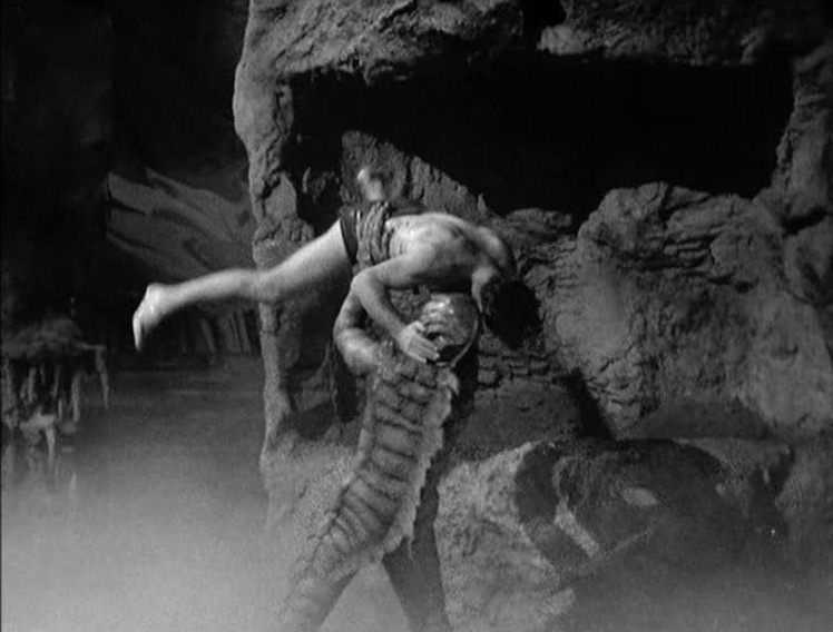 One of the many things you’ve captured in your usual thorough approach is that this movie, like so many more from the decade, is a near-gleeful annihilation of centuries of human intellectual progress. Take a guy festooned in the shiniest, sharpest scientific toys and drop him in an “evolutionary cul-de-sac” and watch how unprepared he is for the indigenous, genetically streamlined locals. This movie, more purely than most from the period, shocks us into re-realization of how puny we really are, so much so that the end of the movie feels like a cheat, with the death of the creature less attributable to man’s ingenuity than to a “happy ending” Hollywood mandate. (Or the creature’s NEAR-death to an even greater Hollywood mandate, as you point out.) I love reading about this type of movie through the Rod Heath prism – which revels equally in the thematic strength of a subject and its original, pure, kid-appeal. More of these!