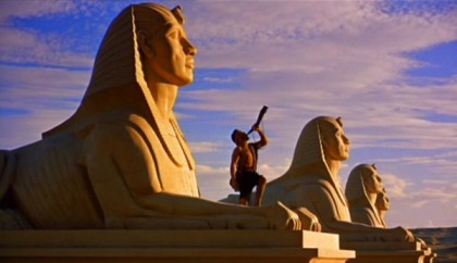 The long set-up of Moses’ exile and return, and the portrait of a world of such outsized power and ignominious humanity is, of course, a long set-up for the biggest takedown conceivable, and DeMille goes to town portraying the various calamities the new-minted, vastly changed prophet wields. DeMille downplays the shock of Moses’ return to Ramses and Nefertiri, though, in a scene that mirrors Nefertiri’s earlier, easy seduction of Moses back to the courtly life, she now fails as the purposeful man declares her “the lovely dust through which God will work his purpose.” Now that’s a chat-up line. But Nefertiri’s new-stoked ardour turns to vindictiveness when Moses not only rejects her, but humiliates her husband and finally, if incidentally, causes her son’s death along with that of all the other Egyptian first-born in a bleak mirroring of the opening slaughter. This act finally breaks Ramses’ will, and he releases the Hebrews. The sequence of Exodus’ commencement lets DeMille do what he did best, stage a vast number of extras heading out into Sinai, stretching the screen’s capacity to hold detail to the limit, a flood of humanity following a suitably spectacular and momentously archaic opening as men blow into horns to announce freedom and great events, framed against colossal walls and vast horizons. Stanley Kubrick, with Spartacus (1960), and David Lean, in Lawrence of Arabia (1962) and Doctor Zhivago (1965), notably tackled similar scenes with an almost competitive gall and still came off a close second, whilst George Lucas and Richard Marquand had the sequence quoted for the kick-off of the Ewok battle in Return of the Jedi (1983).