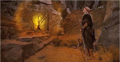 DeMille gains the desired tone of something having run badly out of control, of sublimely self-destructive surrender to chaos not through the actual depiction of depravity, but rather from a mounting sense of madness derived by the maelstrom of actors churning before his camera, swallowing the individuals in the crowd. One of my favourite throwaway moments of the dizzying collage of images here is Carradine’s hangdog Aaron bleating, “Dathan and the others made me do it!” when another Hebrew accuses him of ruining them all by helping Dathan make the idol. Another is when Robinson’s performance hits lunatic grandeur as he happily avenges himself on Lilia by nominating her as sacrifice to the golden calf, and then sings and chants like a pimped-out druid in rapturous delight at his gift as the anti-Moses, the wizard of sin, as Lilia screams, “Are you insane?” from her prostrate perch above her absurdly fickle fellows intending her death. Moses struts in, and, seeing his profound mission already despoiled, has the mother of all hissy fits, hurling the commandments to explode in fire and brimstone on the golden calf and open a chasm that swallows Dathan and his ilk. The coda offers another splendiferous set of images as Moses, called to meet his maker, bids farewell to family and successor Joshua, and climbs back up the mountain to be illuminated in a shaft of light. Like so much of the film, this moment is utter cornball on one level, and yet perfect in another, an authentic vision of heroic stature that transcends dull reality and transfigures human nature.