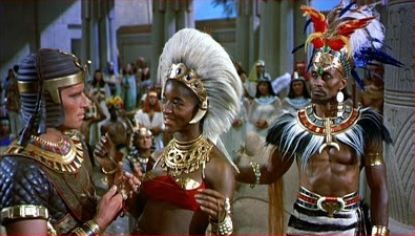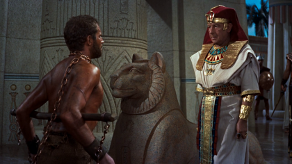 Moses returns from war both as venerated patriotic hero and wise leader, having brought back the King of Ethiopia (Woody Strode) and his sister as allies. With Ramses having fallen behind schedule in building Seti’s “treasure city,” Seti gives the job to Moses whilst ordering Ramses to discover if the Hebrew messiah is alive, as the slaves hope. Ramses would almost be reduced to the Jan Brady of religious epics in contending with his cousin’s constantly recapitulated excellence, except that he’s so swaggeringly arrogant he scarcely doubts for a second that, sooner or later, his birth-imbued status will win out. Between them as a love interest is Nefertiri (Anne Baxter), dissemblingly referred to as the “throne princess” to disguise the prickly detail that she is Ramses’ sister and, as per ancient Egyptian custom, expected to marry her brother. Nefertiri’s preference for Moses is understandably unabashed. Moses’ innate decency almost gets him into trouble, however, as he’s appalled by the Hebrew slaves’ treatment. This comes to a head when Yochabel, employed as a grease layer to smooth the movement of enormous blocks of stone, is almost crushed; stone artisan Joshua (John Derek) saves her life by assaulting a foreman, and Joshua’s girlfriend, waterbearer Lilia (Debra Paget), calls Moses to intervene. Realising that the slaves are too malnourished and exhausted to work effectively, he has grain seized from priestly granaries to feed the slaves and gives them a day off each week. This allows Ramses to impugn his loyalty, but Seti is so impressed by the progress Moses makes that he declares him his heir.
