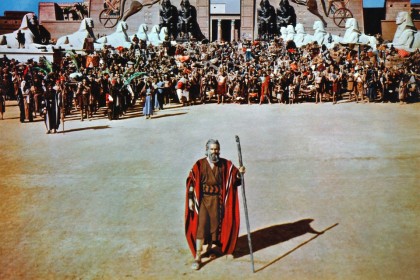 DeMille’s best work usually made such clashes his subject, like the Christian martyr tale in The Sign of the Cross (1932), that gets the audience off on seeing faith tested with pleasures and terrors of the flesh that correlates this voyeurism with the sexual and sadistic impulses of Nero’s Rome. With films like Madam Satan (1930) and Four Frightened People (1934), DeMille tried to examine his audience’s fantasies in a more upfront fashion, with heroines desiring to transform themselves in liberating situations, but both flopped. So it was back to such self-consciously legendary historical films like Cleopatra (1934) and The Crusades (1935), and then, as he sensed post-Depression audiences were getting more parochial, equally mythical studies of U.S. history like The Plainsman (1936), Union Pacific (1939), and Reap the Wild Wind (1942). After WWII, DeMille, who retained such status he was Hitchcock’s only rival for audience recognition amongst directors, revived the religious epic with Samson and Delilah (1949), proving that on the cusp of the 1950s, the audience again wanted lush escapism mixed with a patina of unflinching moral import. DeMille’s instincts proved prescient again as the historical melodrama, usually with heavy religious themes, found natural symbiosis with the new widescreen and Technicolor-blazoned super-cinema that Hollywood was using to retaliate against TV’s growing threat. Coming off one of his flattest films, The Greatest Show on Earth (1952) (of course, the one that gained him his lone Oscar), and 40 years after The Squaw Man, DeMille tackled, in his mid-70s, the largest and most ambitious of his epics, a redo of The Ten Commandments. At a budget of more than $13 million, it was the most expensive movie of its time and one of the biggest money-makers of any time.