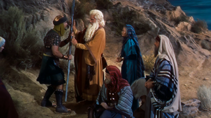 DeMille’s voiceover gets particularly flowery in describing Moses’ torments as he crosses the desert, but lo, masculine fantasy awaits, as he makes it to the well of Sheikh Jethro of Midian (Eduard Franz), whose soccer team of daughters tend to sheep nearby. Moses proves he hasn’t lost his touch as he beats up a bunch of bullying goatherds (damn dirty Amalekites!) who try muscling in on the well, earning him a place under Jethro’s tent. Love blooms between Moses and the odd one out amongst Jethro’s deliriously horny brood, the sober Sephorah (Yvonne De Carlo), in purple but uniquely lush dialogue aiming for Song of Solomon-esque rhapsody. After Moses has married her and they’ve had a son grow halfway to manhood, Joshua, having escaped captivity, turns up dangling rags and chains, forcing Moses to remember the continued state of his fellows. This stirs Moses to at last take the challenge that’s been before him for years, to climb Mt. Horeb and find if his God really lives there. The genuinely weird encounter with the Burning Bush, which causes even Moses to crumple like a fig in awe, segues into Moses returning to Sephorah and Joshua looking like history’s first stoner guru high on his particular, fiery weed. Whilst the parochial school teachers were all nodding in approval, what secret seeds did this film place in the psyches of a generation of psychedelic artists and dropouts, whilst also perhaps instilling quiet fortitude in the minds of civil rights campaigners?