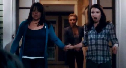 Two teen girls (Lucy Hale and Shenae Grimes), kicking back for an evening, put on the latest instalment in the never-ending Stab series, derived from Gale Weathers’ books about the original murders depicted. They soon find themselves being stalked by a new Ghostface killer, but this whole scene turns out to be the start of Stab 6, which is in turn being watched by two young women (Anna Paquin and Kristen Bell), arguing over the vicissitudes of modern horror movies. Their argument is resolved when Bell sticks a butcher knife in Paquin—and yes, this is the start of Stab 7. Considering that this is exactly what modern Hollywood is starting to feel like, a sequel wrapped in a prequel within a remake, the joke is exact, and the stage seems set for serious, and relevant, meta-gamesmanship.