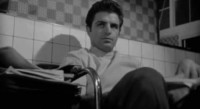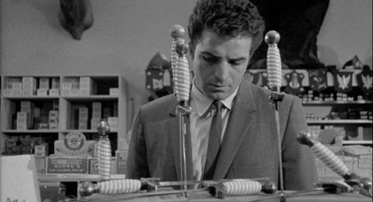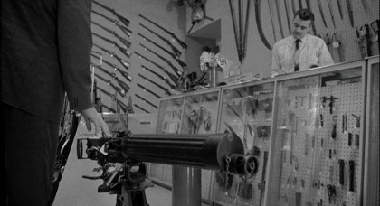 Moon hires hitmen for a mobster named Mr. Vick. He decides to let Claude stew for a couple of weeks after their interview. Famed cinematographer Lucien Ballard shoots Claude in a monotonous routine of dressing, exercising in his room, taking in food trays and tipping the server one of the dimes he has lined up on the table, and waiting for the phone to ring—which it eventually does. Claude is given his first contract, efficiently shown with quick shots of three people tied up in a back room, a sleepy man in a barber’s chair, and Claude emerging from behind a newspaper wearing a white barber’s coat, placing a protective cape around the man’s neck, and grabbing a straight razor from the real barber’s shelf of equipment. Moon pays Claude $500, and at his home, Claude records the sum in a notebook that lists the money he has versus the money he needs to buy the house.