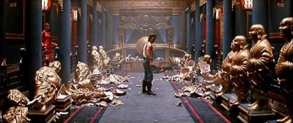 James Hong as Lo Pan is an evergreen surprise. Generally known for playing gaunt, cagey ciphers, a la his role as the guardian of dark secrets in Chinatown, Hong presents Lo Pan as alternately the dirtiest of old men when he’s in his corporeal shell of withered leathery flesh, swearing and teasing Gracie with insidious delight, and a weirdly beautiful supernatural master in his classical garb and make-up, appealing to the unconscious Miao Yin with poetic cadence and quivering with frustrated desire. Such flourishes makes Lo Pan a far deeper kind of villain than the usual run, and Hong’s intuitively perfect performance struck such a deep chord with the actor that he directed a film, The Vineyard (1989), that reiterates aspects of this film’s plot. Lo Pan gets his comeuppance, eventually, but that’s really the throwaway end to a grandiose fight. Carpenter even makes fun of the usually epic deaths of supernatural villains by having Lo Pan succumb to the simplest of implements,with his great collection of plaster buddhas spontaneously collapsing like dominos, as if the gods are marking the passing of a great if evil force. Carpenter’s filming of the preceding fight is a source of constant delight to me, with a comic-book-like clarity of action displayed in the way Carpenter offers frames that are cut in half by swords or criss-crossed by battling opponents swooping from one edge to the other. Such stylistic rigour, light years away from the happenstance gibberish seen in so many recent action films, gives a sense of the physical space, combined with the rapidity of the editing and the dynamism of the stuntmen, in what is still a master class for this sort of thing. Whatever Big Trouble’s failures as a revenue earner, it was a big triumph as entertainment.
