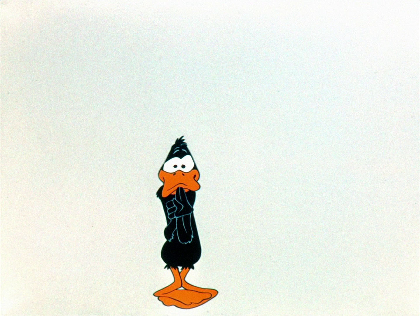 Daffy is what I’d call the solid citizen persona of his creator, Chuck Jones. He knows and has internalized all the rules of his universe. If the scene suddenly changes to a barnyard, he runs off and reappears wearing overalls and carrying a hoe. If he suddenly notices an igloo on the back 40, he exchanges his hoe for some ski poles. If he is confronted with palm trees and ocean, he grabs a lava lava from wardrobe and plays the ukelele with outsized enthusiasm. When he’s tortured by this tyrannical and capricious behavior, he looks for fault in himself, muttering aloud that he’s sure he has complied with his employment contract and hasn’t he kept his figure in tip-top shape? In other words, he’s an actor, though unlike what that label implies, he really reacts to changing circumstances with little complaint, the better to preserve his precarious existence.