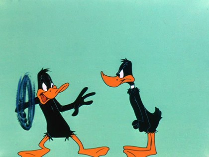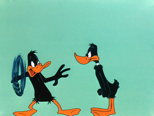 Daffy Duck is the star of the Warner Bros. cartoon Duck Amuck, which starts slyly as a tale of the Three Musketeers—you know, all for one and one for all? Ready to work on a thrilling adventure film, Daffy finds that he has entered the Twilight Zone instead. He finds himself parrying and thrusting onto a blank background. Like a performer awakening a sleeping stagehand, he calls for some scenery to be painted behind him. Alas, instead of 17th century France, he gets a farm.