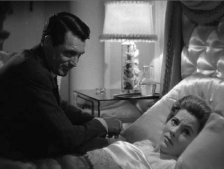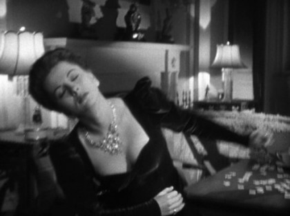 And speaking of sexy, what are we to make of the fact that Lina wears reading glasses? This certainly doesn’t impede Johnny from flirting with her, though she hastily tears them off when he shows up at her house. All through the narrative, when she must read a telegram, a newspaper, or a letter, Lina looks at the piece of paper, adjusts its distance somewhat, then fumbles for her glasses. The few seconds that it takes for Lina’s sense of vision to come through, clear and unobstructed, correspond to the sudden changes of register from the comic to the dramatic that punctuate the entire picture. A telegram turns out to be an entirely unexpected missive from Johnny that draws Lina out of the depths of depression into ecstatic expectancy; an innocuous newspaper sows the seeds of suspicion that Johnny murdered Beaky; a mundane letter from the insurance company convinces Lina that she will be Johnny’s next victim. The reading glasses thus become instruments signaling a series of vital changes in the narrative, never mind if some of the changes they effect are erroneous perceptions on Lina’s part.