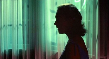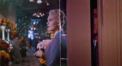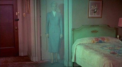 Vertigo has its debts, of course: Hitchcock, a cineaste’s cineaste, was surely keeping Lewton’s films, William Dieterle’s Portrait of Jenny (1945), Luis Buñuel’s El (1953), and possibly even the film that made him want to be a moviemaker, Fritz Lang’s The Weary Death (1921), in mind. In such progenitors, the preternatural forces of psychological desperation and wilfulness warp reality, and symbols of Freudian fluency multiply. Vertigo seems to tease falsely with promises of the supernatural, from the haze of the otherworldly that hovers around Madeleine in her early cemetery visit to the green light that is the chrysalis for the reborn Madeleine in Judy’s hotel room. One of the most strange and disorienting moments comes when Scottie follows Madeleine from a back alley into an unknown building, a brief trip through a shadowy labyrinth that resolves when Scottie opens a door to catch sight of his quarry in the midst of a flower shop, a commercial space transformed into a sea of impressionistic colour outside of reality, with Madeleine a spindle of spectral grey and platinum amidst a wealth of fecundity. This pretext of the unearthly is nominally in place to pull a fast one for a plot involving very corporeal murder and conspiracy, and yet by the end, the uncanny texture has not dissipated, though the film becomes bruising in its immediacy: the motifs of haunting, possession, unseen forces, of the past’s death grip on the present, of romantic period melodramas of tragic ladies and imperious men, are all revealed, far from being remote, unreal, and storybook, as literal and dangerous.