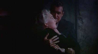 Just as Judy is not entirely guilty, Scottie becomes increasingly less innocent in his subjecting her to the ritual of exorcism by again ascending the tower, hauling her up the stairs with a savage exultancy to his anguish. Novak as Judy lets her capacious breasts hang freely under a sweater whilst her face is overly made-up to lend her a cheap and brassy ring that is nonetheless less far more earthy-seeming; Madeleine’s passively blank façade gives way to the lynx-like tilt Judy’s face offers as she wards off Scottie. Whereas in Rebecca, Rope (1948), Strangers on a Train (1951), and later in The Birds and Marnie, Hitchcock was willing to suggest, with differing amplitudes and intentions, a protean sexuality underlying the drama, here, same-sex attractions are kept out of the equation. The tale becomes rather a passion play for the way men see women and women see themselves through men, therefore ironically drawing out even more precisely the element so prized by camp aesthetics—a heightened awareness of the construction of femininity through carefully wrought signifiers.