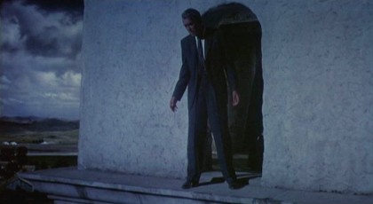 Stewart’s career-best performance as Scottie is a thing of awful beauty, shifting his character from a neurotic, but avuncular presence in early scenes to an excruciatingly single-minded zombie in the later sequences: even when he’s oppressive and frightening, it’s still all too easy to empathise with Scottie’s sense of howling disillusionment, aggrieved rage, and still-guttering desire for a lost ideal. Like Norman Bates, a much more overtly mad and homicidal antihero, Scottie is an attempt by Hitchcock to explore more deeply a unity of opposites, hero and villain, victim and perpetrator, always constantly lurking under his variations on the “wrong man” tales. Like Norman, the battle sees Scottie reduced to a virtual catatonic, locked like a bodhisattva in a state of profound collapse, personality and perspective in total flux, and like Norman, he engages in an extended act of perverse ventriloquism for a dead woman. Unlike Norman, Scottie emerges from his crisis, but his end is scarcely any better. Perhaps the most heartbreaking moment in Vertigo is the brief window between Judy’s transformation back in Madeleine, and Scottie’s realisation that she was her all along and the hideous joke that’s been played on him. Scottie is at his most relaxed and good-humoured since the start of the film, and Judy is newly joyous. This idyll lasts about 30 seconds, but the pull it exerts is powerful, as it suggests that both of them have actually found the happiness they sought. Yet here Hitchcock is at his most consciously unremitting: the illusion, however gratifying, most immediately crumbles. As Judy realises where Scottie is taking her, her acute discomfort is well-founded (has anyone done a survey of the many scenes in Hitchcock’s films where people have dramatically telling trips in cars together?), and Scottie, in his moment of exorcism and revelation, becomes the animal, wolfish and savage, Judy now cowering like a rabbit until he exhausts himself and gives in to her entreaty, but fate still has its very last card to pull. Unlike his counterpart in Boileau and Narcejac’s novel, Scottie does not murder Judy to close the circle, but instead puts her in the place of the dead woman, and whilst her death is accidental, Scottie is still irredeemably tethered to Judy’s sad end and can only hover on the edge of oblivion, look upon his own works, and tremble.