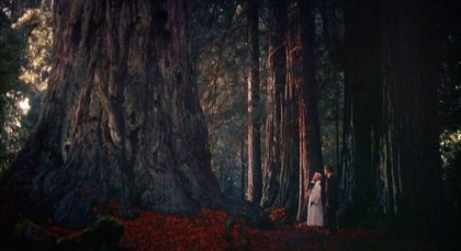 Everything becomes charged with a significance in this world, from the paintings that enclose secret meanings and reflect essential, half-sensed truths for the attentive, to Madeleine’s subsequent pause before the waters of the Golden Gate to crumble a bouquet into the bay, perhaps the film’s most famous image, possessing an intangible, atavistic power. Of course, in America there is no boatman for the River Styx, but rather a suspension bridge suddenly transmuted into a totem as weightless and fragile as the equally totemic petals that Madeleine casts into the waters, followed by herself. In a sequoia forest, as silent and reverential as any cathedral, Madeleine tries to measure her “past” life as Carlotta upon the rings of a sequoia cross-section upon which other markers of history passing are fixed—the Magna Carta, the Declaration of Independence—triumphs of the official version of history, inimical as that often is to subtler truths. James Joyce’s Stephen Dedalus called history the nightmare from which he was trying to wake up, but in Vertigo, the nightmare is ongoing, inescapable. Scottie’s nightmare, which precipitates his total collapse after Madeleine’s death, ends without a sense of awakening, but rather, as Scottie sits up, grief and fear afire in his eyes, it’s plain that the dream has invaded his life.
