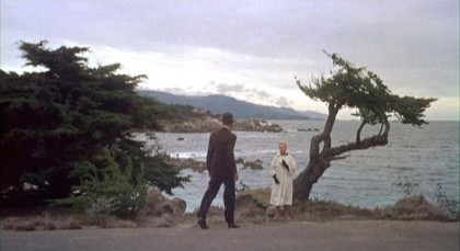 Just as individuals create chains of behaviour that result in recurring tragedy, contemporary California rests on a colonial background, an older world transposed onto new shores and almost—but not quite—smothered by the modern, still glimmering through the haze, much like the tell-tale sign that is the necklace which finally enlightens Scottie, and the small, preserved Mission San Juan Bautista becomes the crux of colliding past and present. Such motifs evoke not only the secret, mostly subsumed, yet still lingering hints of a past based in invasion and forcible claiming of a foreign land, something that’s not supposed to haunt America but does, and also of spiritual reckonings, as the ghostly black shape that looms out of the darkness that causes the very last ironic tragedy proves not to be a ghost or a killer, but a nun, incarnation of a judgement that falls on everyone.