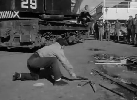 Nonetheless, Slaughter on Tenth Avenue is extremely satisfying. Sterling’s performance as a tough-minded widow is beyond good, showing the various emotions of a worried wife tending to her dying husband and a strategic witness who avoids taking the stand until after Christmas to ensure that the killers will be convicted and get the electric chair. Duryea, not at his most evil but certainly at his most articulate, has a field day with the excellent dialogue and legal logic screenwriter Lawrence Roman provided to him; Duryea certainly is one of the best actors to emerge from mid-century American cinema. A wonderful turn comes from diminutive Nick Dennis, who plays a longshoreman nicknamed Midget who goes ballistic the day after the attack on Solly, drinking and cursing the union bosses who had him hit. As the goons who shot Solly chase him around and through the dock machinery, we see how vulnerable a single man is, with only his speed to keep him ahead of deadly force, as his coworkers opt to keep their mouths shut to live to see another day. Mickey Shaughnessy spits his contempt for the men who attacked him during his deathbed deposition, lifting his hospital gown to show “Cockeye” exactly what his guns did; while we see only blood-stained gauze, the gesture is still shocking. Julie Adams plays Keating’s fiancée and wife with more presence and authority than her “little woman” role normally would have afforded her.