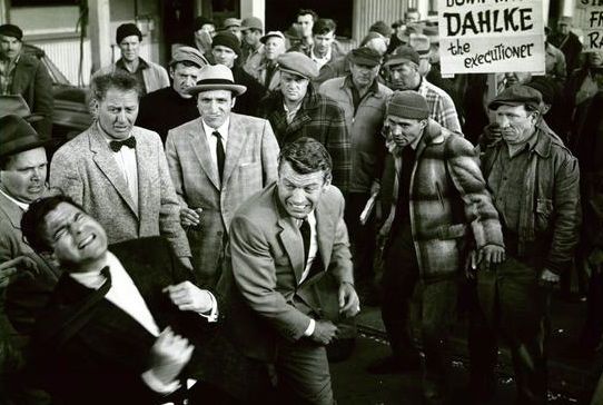 What makes Try and Get Me! truly extraordinary is Cy Endfield’s direction, his last major American film before the Communist witch hunt of the 1950s gobbled him up and forced him into exile in England, where he continued to make powerful films such as Hell Drivers (1957) and Zulu (1964). His camera is always on top of the action, as we can practically feel Miller rolling down the hard gravel to his doom and imagine his murder from indistinct movements Howard only hears and interprets with a wretched, horrified face. I have always wondered how a well-guarded jail could be breached by a mob. Now I know. Endfield’s climactic scene builds in intensity as the mob masses and works together like a colony of army ants to overpower the tear-gas-wielding cops with fire hoses and pull open the doors of the jail with gangs of men pulling on ropes in unison to the cries of “heave, heave, heave.” The audience in the Castro Theatre was breathless with horror, watching with compulsive fascination the extraordinary staging of one of the most compelling scenes ever committed to film.