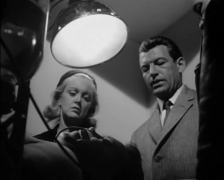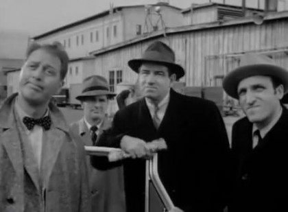 In a very suspenseful opening sequence, we watch three men arrive at an apartment building on 10th Avenue and spread out to cover all exit routes, climbing on the roof and entering the stairway from the top and stationing themselves in blind spots from below. A car pulls up in front of the building—it is Benjy Karp (Harry Bellaver), who always gives his friend Solly Pitts (Mickey Shaughnessy) a ride to work. Solly’s wife Madge (Jan Sterling) yells down that Solly will be right there. After some affectionate banter, Madge hands Solly his metal lunch box and sends him off with a kiss. Moments later, Solly is cornered and gunned down. As the gunmen flee, Madge runs to her husband who says, “‘Cockeye’ Cook (Joe Downing) and two of his gorillas did it.” He is taken to the hospital, gravely injured.