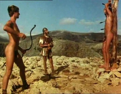 Amidst the small band of soldiers, the leading personality is Maximus, a dirty-minded git with a false nose strapped to his face and a false penis sometimes strapped to his groin. He has a relentless hunger for amusement and dirty by-play, whilst the other bored, horny soldiers turn to each other for gratification after looking at dirty pictures. One of the soldiers, Justin (Richard Warwick), empathises with Sebastian’s plight and tries to understand his strange idealism, which, as Sebastian meditates on his own, seems partly composed of narcissism—making his prayers whilst gazing at himself in the water—and lust, as he wishes to be embraced by Jesus. Sebastian communes with his rugged landscape and prays, conflating the sun god Phoebus Apollo, whom Sebastian used to worship, with his version of Jesus. So the searing touch of the sun, of which Sebastian gets plenty when Severus has him staked to the ground as a punishment, is only more ecstatic bliss for him.