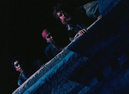 The alternately tedious and violently compelling proximity of Eros and Thanatos is an obsessive refrain in Satyricon, depicting a world mostly lacking the kinds of safety cordons between activities and moral precepts we’re used to today precisely because the cycles of life and death move much faster, push harder, demand reflexive action. Antihero Encolpius is finally stricken with impotence – “I’ve lost my sword!” – in the film’s concluding scenes, stripping him of his purest device for expressing his life-lust after his many adventures driven by his own erotic urges and those of others. The only quality that elevates him over most of these others is that he is sometimes touched with an effervescent poeticism that comes at the end of such ventures. When Encolpius and Eumolpus stumble drunkenly away from Trimalchio’s company, they fall down on a ploughed field as the poet recites rapturously and offers his spiritual gift of poetry to the younger man: the path through absurd plenty and grotesque wealth has granted the two men a moment sheer, unbridled beauty and essence-grasping. But Encolpius’ finds his life about to take a strange turn, as he’s picked up from the beach where he fell asleep by slavers and dumped in the cargo hold of a ship, where he finds himself accompanied by Giton and Ascilto.