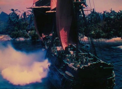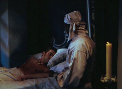 Pan, true to his name, repeatedly leaves behind his invented lovers and overlords for wandering in forests and lounging on hillsides, escaping into nature, although even that can be feverishly eroticised, as when he gets caught up in reeds that he finds he has to please in a phallic manner, whilst drenching rain falls on him. At other points, Pan lies on a grassy patch of ground, playing with the butterfly seen hatching at the start, an emblem of furtive sexuality itself, in a state of constantly becoming. Pan’s connection with nature suggests a part of Bidgood’s mind pining for the lazy sensuality and beauty of a boyhood on the farm, caressing himself all over with a blade of grass in shots where Bidgood renders Kendall’s nipples or navel as universes in themselves, which indeed they can be on such a sensual, nerve-sense level. In actuality, Pan tries to match the imagined/remembered sensation by pouring champagne on himself. Bidgood’s camera strives to record sensuality in such moments on an intimately physical level, communing with his audience through sense-memory stirred by vision: it’s hard to think of more intensely sensual moments in cinema. Bidgood’s hunt for such electric visual similes for sensatory experience also sees a bundle of pearl necklaces caressed in phallic manner during the belly dance scene. This image leads to a climax, in both sense of the word, for the sequence when Pan’s sadistically stoked excitement demands the belly dancer be executed by the Sheikh’s bodyguards. The dancer is hacked down with scimitars, whereupon Bidgood fills the screen with a colossal penis jutting at the camera, squirting spunk both real and gleefully animated in pearl-like globules shooting through the air.