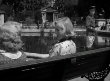 Claire Bloom is wonderful as Nan. The script doesn’t really build the reasons for Nan’s affection for Alec, but if the romance comes up a little abruptly, it certainly seems genuine. The change of the character’s name in the book from Liz Gold to Nan Perry may have been an attempt to distance the character from a perception that she is Jewish and soften what would have been a more strident variety of Jewish Communism to one that emphasizes world peace. This choice works in making the romance between Nan and Alec seem more genuine, and has the additional benefit of isolating Fiedler as the lone, identified Jew in the film. His opposition to Muntz, a former member of the Hitler Youth, sets up an ideological struggle—perhaps the only genuine one in the film—that makes the pragmatic choices of both sides look very bad indeed.