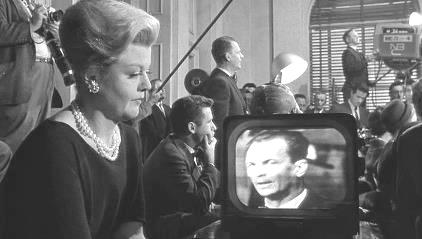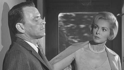 Sinatra, although a producer, took the less showy role of Marco, and it served him well, as although Harvey and Lansbury dominate much of the film, he plays river guide on the trip up to Hades. Sinatra’s persona as the knight of cool purveyed as a singer almost always gave way in his mature screen career to far more thoughtful and ambivalent characters, perhaps as a way of mediating the intense discomfort that made him such an infamously dichotomous character. Either way, Marco as a role plays on his bulletproof aura to lend power to the spectacle of him as sweltering crack-up. Marco’s recovery and return to able and persistent hero cuts across the increasingly neurotic and fraying tone of the story. In an early scene, Marco is visited by an army pal, Colonel Milt (Douglas Henderson), who surveys the great piles of unhealthily intellectual reading matter Marco’s been consuming in his insomniac hours, reading which, ironically, has equipped Marco, in the mould of the perfect Kennedy-Camelot-era hero, for a new frontier of struggle, one for control of the mind (one reason why in spite of its abyssal cynicism, I still often think of this as the exemplary Camelot-era film), and Marco listlessly explains his reading habits, giving himself away as a closet intellectual, not the muscular man of action the military needs. Sinatra’s punch-drunk performance sells the scene and invests the first half of the film in particular, with a sense of aching, fraying anxiety, one that begins to ease once he meets kind-hearted hipster Eugenie Rose ‘Rosie’ Chaney (Janet Leigh), who readily falls into an exchange of brittle punning and queasy humour to ease him out of his panic attack.