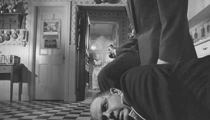 Like many an eager young American director before him and after, Frankenheimer’s style was powerfully influenced by Orson Welles. The influence is obvious in Frankenheimer’s forced-perspective shots bristling with Hogarthian energy and looming faces, people turning into aspects of the landscape or relics of ages and objects turning faintly animate. Canted camera angles illustrate moments of nauseous disorientation, as when Marco confronts Rosie with a newspaper revealing the murder of Jocelyn and her father, and desperate action, during Marco’s final rush to try to head off the final act in the long and torturous plot. Hitchcock’s influence is also certainly in the mix, in the punch-at-the-camera shot that commences Marco’s fight with Chunjin, in the brutalist jump cuts conveying the sleep-rupturing power of the awful dreams taken from Vertigo, and The Man Who Knew Too Much’s (1934/56) imprint on the carefully orchestrated climax in a bustling forum. But there’s also the incipient influence of new wave and TV news techniques informing the creeping super-modernity of the story, handheld camerawork suddenly and vibrantly creeping into the lexicon of mainstream Hollywood during moments of furor in public places like the press conference and the political rally. Indeed, as prejudicial as it sounds, Frankenheimer’s use of handheld technique probably planted the seeds for the eventual evolution of the pseudo-realist habits that would later grip mainstream cinema. Certainly the most famous flourish Frankenheimer conjures, one he’d revisit in variations in later films, comes when Raymond shoots Senator Jordan, his bullet passing through the milk bottle he’s holding, the white liquid spitting out in sickly simulacrum of blood.
