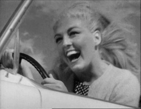 The usual veneer of sociological import is suggested by the opening voiceover by John Furlong, which rings in the ears as animated bars resembling soundtrack strips slide down the screen before the explosive editing of the go-go club scene, an opening that’s a unit of sheer pop art perfection. Meyer aims to deliver cheap thrills immediately with the dancing sequence followed by fast driving and then a spat between Rosie and Billie that sees the two dripping-wet pussycats grappling in an angry brawl, whilst Varla looks on in amused irritation. Soon enough, the film takes a dark turn when the trio, having arrived at a salt lake racing track, encounter Tommy (Ray Barlow), a speed enthusiast with gentlemanly affectations, and his trim, bikini-clad girly girl, Linda (Susan Bernard). Varla provokes Tommy effortlessly into competing with her in a lap race. When it looks like he’ll win, Varla cuts a corner and forces Tommy off course, almost causing an accident, and then starts bullying Linda. When Tommy is sucked into asserting himself violently against Varla, she takes great delight in beating him bloody and then breaking his back.