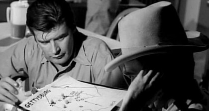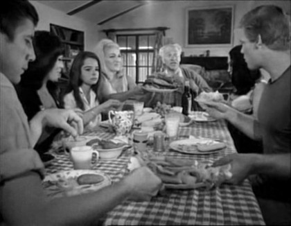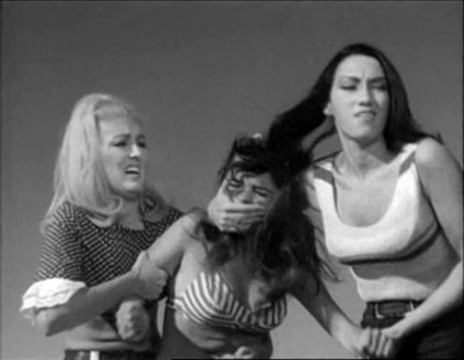 The second great notion of Faster, Pussycat!, after its villainesses, is the idea of playing them off against masculine characters who are enacting the kind of twisted macho intrigue then very popular in mainstream American drama, in theatrical works like Death of a Salesman and Cat on a Hot Tin Roof and movies, especially in many 1950s westerns, where a failing patriarch and rebellious, insufficient sons battle out their psychodramas. In those works, women are usually passive or manipulative bystanders, but here the genders are actively at war, an idea that both subverts and extends that theme. There’s a kind of fantastic equality in the equation that was utterly new when the film came out. The film’s lone interval of relieving cordiality occurs when the two camps sit down for a meal; all parties act their various parts and tenuous amities form between Billie and the old man through their shared love of whiskey, Billie sympathizing with the captive Linda, and Varla coming on to Kirk. Soon enough, however, the situation erupts, when Billie deliberately gets drunk enough to give Linda a chance to escape. The old man hopes to track her down first and subject her to Vegetable’s abuse, causing the others to reflexively chase after her to thwart his depraved intent.