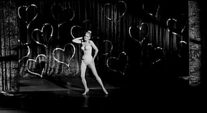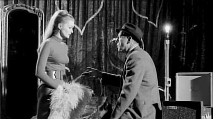 Cathy is defined, sequentially, as an intellectual, a stripper, and a tragic lover, and Fuller photographs her as lonely, distinct from her milieu, standing out all the more individually the more Johnny sinks into his, often presenting an overt contrast between her fraying emotions and her ludicrous dress, whilst patronised all the while about her concerns about Johnny. Johnny puts his body on the line in an even more profound way than she does, partly, it’s hinted, out of frustration. Cathy’s stage act is comparatively tame, whilst one of the more dim-witted women she works with remarks that the only act that would be worth anything is one that goes all the way, which is precisely the enterprise Johnny’s engaged in. Johnny’s fantasy of Cathy has nothing to do with the real woman, but the one who embodies the wispy erotic-emotional fantasy on stage. Later, he entirely reconstructs her into an untouchable icon of desire by identifying her with the fake sister she’s embodying, unable to reconcile the disparate versions of womanhood Cathy inhabits that he can’t cope with.