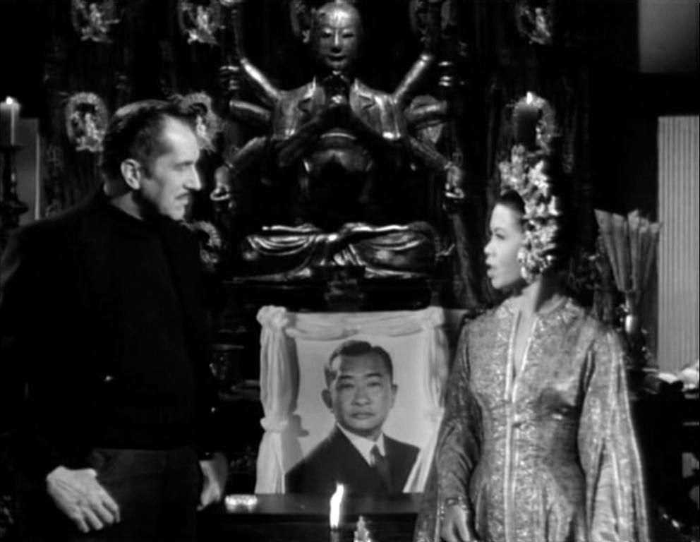 Vincent Price plays Gilbert De Quincey, supposedly a descendant of Thomas and following in his existential footsteps, an adventurer and occasional opium fiend who washes up in San Francisco’s Chinatown in 1902. In a lengthy prologue, his voiceover helps weave a fantasy texture as a gang of tough-looking men on a beachfront discover a rotting skeleton wrapped in seaweed, one eye gazing out malevolently, whilst out at sea a boatload of captive Asian women are being transported to the shores of America on a huge junk. The women are hauled out of the hold, and the crewmen herd, batter, wrestle, and hurl the girls into a great cargo net to get them off the ship and onto a waiting schooner before a Coast Guard cutter reaches them. When the schooner’s crew bring them on the beach, the waiting men prove to be rescuers who try to overcome the slavers. One of them, who is revealed later to be crusading newspaper editor George Wah (Richard Loo), engages in a battle with one of the pirates who threatens one of the girls, Lotus (June Kyoto Lu, credited as June Kim). George is knocked down by his opponent, but the pirate is suddenly attacked by a panicked white horse, which kicks him over a cliff. Some of the pirates’ confederates arrive in a car and quell the battle with a blast from a tommy gun. The drag away Lotus from Wah’s crumpled body.