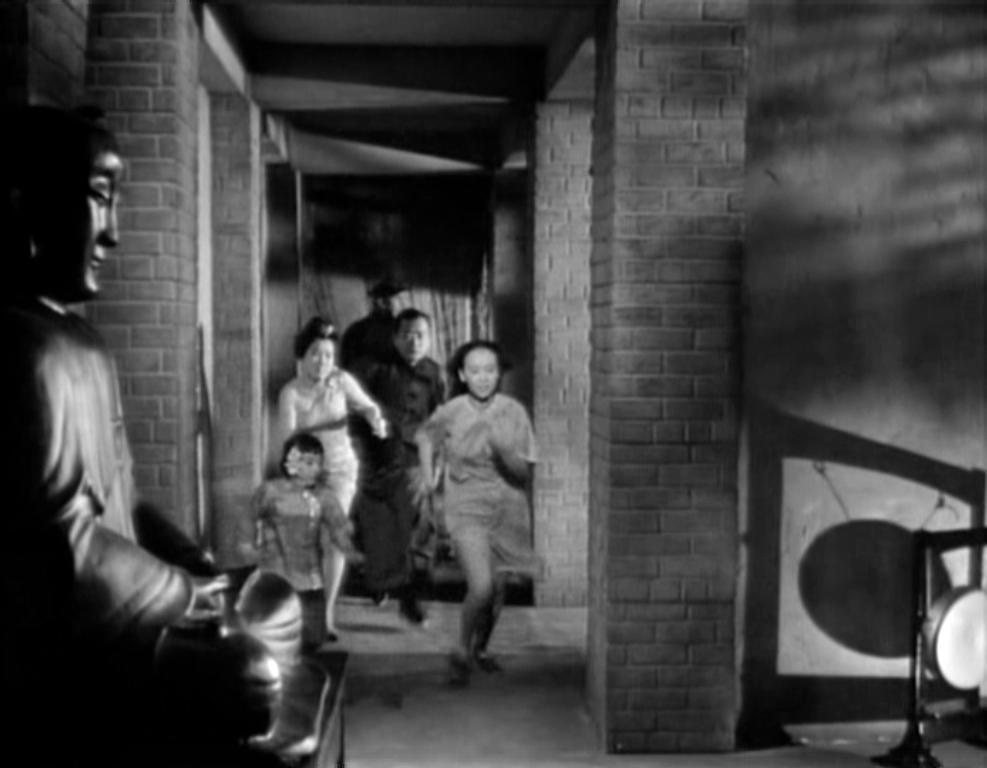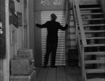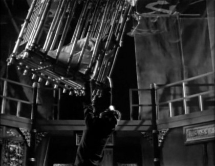 The film’s most memorable scene comes halfway through, when, having been separated from the women in escaping from Lin Tang’s dungeons, Gilbert hides out in an opium den to which he finds a secret door in a toilet cubical. After smoking a pipe and going into a delirious dream in which severed hands crawl around and Ruby’s face merges with that of a grinning alligator, De Quincey wakes up as enemy goons assault him. Replicating the hero’s dazed, drugged-up state, Zugsmith shoots the next five minutes of the film in woozy slow motion, at first without any sound. De Quincey makes an escape by leaping from bunk to bunk in the opium den, knocking over his assailants, and then hurling himself out a window, only to find he’s on a high floor, and finishes up sliding down a roof to hang desperately from a gutter. Zugsmith draws out the quickest motions to unbearable lengths (aided by composer Albert Glasser’s eerily droning Theremin music), as Gilbert wavers on the edge of a great drop, unable to got back or forward, as a hatchet-clutching henchman leaps after him from one balcony, and another with a gun lines up a shot from a distance away. De Quincey makes a leap through an awning onto an adjoining balcony and climbs through a window, only to encounter a smiling, yet creepy butcher who wields a huge cleaver to cut the head of a pig’s carcass in half. Gilbert runs on through the building, passing through a disarmingly quiet tea parlour and then hearing someone shouting “help!” and following the sound. It proves to be a squawking cockatoo, which is scared off its perch as bullets smack into the wall behind it, and Gilbert is chased again by goons, driving him to take a fall off a balcony where, instead of falling normally to earth, he’s transmogrified into a spinning cut-out. When he awakens next, he gets a dish of water from Ruby right in the face (the camera), ending the dreamy state with a shock. It’s one of the most original and unique action scenes I’ve ever seen, and, in its way, as formally radical as anything being done in the era’s art cinema.