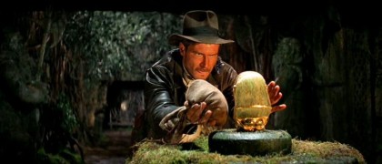 A famed film studio’s logo dissolves into a real mountain, glowering like a primeval sentinel over the depths of Amazonian jungle. A team of searchers penetrates the unknown. A man with a shadowed face, hearing a gun cocked behind him, turns and lashes out with a bullwhip, disarming his would-be assassin. The killer flees, and the hero steps into the light. He immediately lays claim to both the ancient temple ruin that is his goal and to the cinema screen as a private stomping ground for him and all like him: the adventure movie hero.