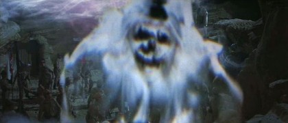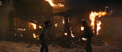 The contradictory character of Fairbourne’s reminiscences extend when the “days of peace” end and Learoyd’s band of warriors venture down through the jungle to do battle: “The death-agony of the Japanese Army in Borneo was as sad as the sinking of a great ship…hunger, men eating weeds, leeches, insects, and each other—despair—madness…for me, for us, the same period was as thrilling as a cavalry charge, may god forgive us.” This cues an ironically high-flown montage of Learoyd, Fairbourne, and the others exalting in triumphant battle against their crumbling foe, cueing even a nod by Milius to Bridge on the River Kwai (1957) as they destroy a bridge modelled on the one in Lean’s classic as Basil Poledouris’ score surges in heroic zest. But boyish triumphalism gives way to fathomless horror as their guerrilla army must contend with Mitamura’s elusive “phantom” column, which, fleeing the Allies on the coast, works its way inland apparently wiping out everyone in its path. Tracking this enemy, Tenga is the first to realise that Mitamura’s column has turned cannibalism into a survival method, and the realisation of the depths to which Mitamura’s men have sunk sparks a race to prevent the column from reaching the Comanche capital. Milius pulls off a bravura sequence with nightmarish overtones as Learoyd and his army try to set an ambush for the column in the moonlight, the eerie sight of the enemy marching silhouetted against the sky, only to vanish when the moon is swallowed by cloud; when Fairbourne fires off a flare, a strobing vision of yowling, demonic enemy soldiers charging their position are glimpsed before a chaotic melee is joined. As dawn comes over the battlefield Learoyd realises that the much of Mitamura’s force slipped through, and nothing now stands between it and the home village.