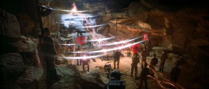 One particular reason why I love Jedi is because it’s the episode that’s most in touch with its pulp forebears, quoting from a broader range of such models with humour and a solid, physically concrete lustre. The film’s first third is essentially an extended riff on pirate flicks and Orientalist adventure sagas, with Jabba as a particularly caricatured Sydney Greenstreet-esque sheikh, with his dancing girls and court of sycophants fugitives from some particularly overworked id. Those tropes are blended with some monster business, as Jabba drops those who displease him into a pit with the ferocious Rancor, in the most successful of the series’ many hat tips to Ray Harryhausen. The familiar, oversized grandiosity of the Fritz Lang-esque sets and the proliferation of bizarre alien faces here is invested with defiantly dark humour and an edge of weirdness more intense and psychological than anywhere else in the series: for example, C-3PO and R2D2 are ushered into a robot dungeon where unruly fellow droids are being tortured, and Jabba’s gremlin pet laughs in mockery at the humiliations doled out to those who incur his displeasure. The crypto-S&M edge reaches an apotheosis when Leia, caught in the act of trying to extract Han from his hibernation, is chained to Jabba’s throne as his latest harem girl, reduced from a heroine hitherto defined by independence and asexual power to a scantily-clad pet abutting the distinctly penile monster. It’s an image that provoked a million adolescent fantasies; rumour has it the whole concept was concocted in riposte to Fisher’s complaints she never looked like a woman in the earlier episodes. In the context of the series’ elemental logic, it’s practically a rape fantasy, and interesting as just about the only overt element of eroticism. The creative team leaven it by giving Jabba’s comeuppance to Leia herself, who strangles her would-be enslaver with her own chains, a surprisingly potent image of female self-reclamation riding on the back of soft-core sexploitation.