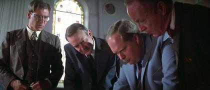 The menace and power of the Ark run in counterpoint to the main business at hand, until finally taking over. A sense of biblical foreboding is established early in the film, the Ark’s mystique and fabled power eerily depicted as an illustration in a colossal tome (“Good God!” “Yes, that’s just what the Hebrews thought.”), and the haunted monologue of Brody, who describes it as “like nothing you’ve gone after before,” at which Indy initially scoffs, and says rather “that thing represents everything we got into archaeology for in the first place.” The tantalising power of the Ark as a symbol and enticement for the imaginations of the “raiders” pursuing it pushes the film’s central motif out of the realm of a MacGuffin—a mere object driving the plot—to become a genuine source of drama, a kind of enigmatic protagonist in the tale (working, in a way, not unlike the hotel in The Shining, 1981). Later, as Indy and Salah interview an aged imam (Tutte Lemkow) who translates key inscriptions on the headpiece, shadows and mysterious winds hint the import of the quest, and the foreshadowing intensifies in a deftly weird little scene where the Ark’s mysterious power makes rats tremble in fear and scorches away the swastika on the box around it. The talismanic sense of awe Jones half-unwittingly chases is matched by Belloq’s constant ability to hook Jones’ psyche with his own ability to invoke that awe, culminating in the moment he disarms Jones purely by pointing out their inconsequentiality in the face of the Ark’s embodiment of history. “It’s a transmitter for talking to God,” Belloq blasphemously characterises the Ark, revealing that his sense of faith is a blissfully utilitarian one.