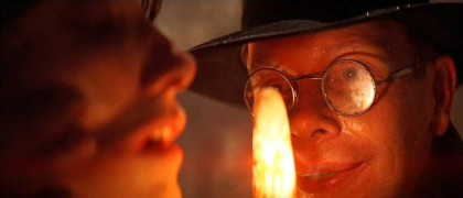 Jones is equally beset by weaknesses and lapses in character and judgment. His shifty associates in the opening who nearly get him killed and spoil his coup of discovery signal over-willingness to rely on expedience. He’s affected physically when a female student flirts with him, a temptation he’s clearly given in to, as he’s had a jailbait romance with Marion, which spoiled two of his best friendships. He’s “fallen from the pure faith” of archaeology in his adventuring and his engagement with a back-alley version of his scholarly craft. Jones was certainly an attempt to create a kind of ultimate adventurer as a centrepiece for an ultimate adventure yarn, with the implicit understanding that true adventurers are more than a little asocial. He’s the man with a past, with the zest of Flynn, the lethal cool of Bond, and the slightly frayed, intense humanity underlying the stoicism of Cooper and Bogart. Some of Jones’ traits surely reflect the influence of the other two Movie Brat auteurs who had a hand in creating him, screenwriter Lawrence Kasdan and Philip Kaufman, who was also on the fabled Hawaiian holiday with Spielberg and Lucas that resulted in Jones’ genesis. Jones is closer to the often much less adamantine creatures of film noir and the more adult variety of melodrama by Hawks and Ford revered by Kasdan and Kaufman than the flatly iconic figures of pulp and the serials heroes. After Jones became Spielberg and Lucas’ baby, he softened and largely lost his darkness; indeed, it is first intensified and then scrubbed out of him in the nominal prequel, The Temple of Doom. In his first outing, Indy is a sometimes feckless, occasionally downright bloody-minded opponent. Indy’s rough-and-tumble sensibility is however first shaken when he thinks he’s accidentally gotten Marion killed, and he walks on a knife-edge of suicidal/homicidal anger when he meets an especially taunting Belloq.
