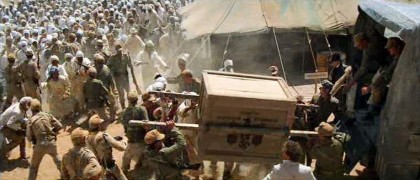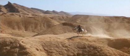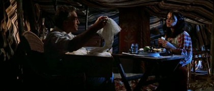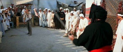 Milius intriguingly comments on a scene from one of his favourite movies, Lawrence of Arabia (1962; Milius notably utilised Lawrence’s editor Anne V. Coates), in which Fairbourne, like Lawrence, recognises himself, as a neutral in a tribal setting, as capable of enacting a prickly law to satisfy both sides. But whereas Lawrence took a guilty but liberated, sadistic pleasure in acting like godlike judge of a murderer, Fairbourne is faced with a worse predicament: as per the custom of one tribe, the child of a recently dead mother must also die, but another of Learoyd’s tribes, from which the mother came, would then demand vengeance on the killers, thus evoking the spectre of another blood feud. Fairbourne volunteers to execute the child instead, and seems primed to do so before Learoyd suddenly interrupts and claims the child. “How could you do that?” Learoyd demands, appalled, of the Englishman, who retorts in relief, “How could you let me?”