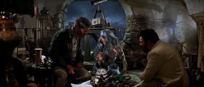 Otherwise, the action-adventure element of Jedi is beautifully straightforward, and the zest of the set-piece action scenes, including the speeder chase through forest trees at unnerving speeds, are still technically impressive and entertaining, all the moreso for not being belaboured. The series appeal to a delight in nerdish detail is likewise as strong as ever here: the exactly designated spacecraft, the fleetingly glimpsed characters with striking, weirdly memorable looks and names, including Jabba’s underling Bib Fortuna (Michael Carter), Lando’s blithely introduced sidekick for the final battle, and the much-loved Admiral Akbar (Tim Rose), the rebels’ crayfish-faced commander. Lando’s evolution from shifty corsair to swashbuckling hero, clearly taking cues from many an Errol Flynn forebear, is completed as he leads the seemingly doomed attack on the new Death Star and refuses to buckle in the face of impossible odds, convincing Akbar to stick it out in a space battle that rewrote the book on special-effects spectacle. It’s tempting to state that special-effects arts had reached a kind of perfect mean with this episode, rendered with intricacy and more sophisticated than almost anything seen before and yet retaining a physical, tactile quality that CGI, with all its fancifulness, would lose: it’s the fearsome beauty of the battle scenes that has always gripped me, the sense of real, gigantic hunks of metal smashing into each other, the wild, frantic battles that wend between the great ships, and the final race of Lando and Wedge (Dennis Lawson) into the heart of the Death Star to destroy it. The three-tiered struggle of the finale—the space fight, the forest guerrilla war where the Ewoks try to buy the rebels under Han and Leia time, and the multiplaned duel of wits and will between Luke, Vader, and the Emperor—is sustained with a use of dialectic montage that’s a long way from Griffith and Eisenstein and yet linked, and it’s achieved with a deceptive ease that demands admiration: in spite of the rapid shifts of focus and tone, the action retains a seamless, associative integrity, with no shot that’s incomprehensible, no action that is poorly linked with another.