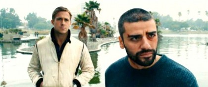 In spite of the pop songs used like a Greek chorus, the aptly Tangerine Dream-esque music score by Cliff Martinez, and squiggly hot pink Miami Vice-esque titles, Drive is, on closer examination, no mere retro-cool tribute. Drive isn’t really an action movie, avoiding a big climax or major action scene, almost to the point of feeling anticlimactic and too self-conscious about its elevated ambitions. Vicious and thrilling moments certainly arrive, yet Refn, whilst certainly fascinated by and talented at describing carnage, is always trying to capture its awfulness, the jarring horror of lives ending in the blink of an eye. He deliberately upsets the usual moral impetus of such films by making the Driver’s acts of retaliation as ugly and repulsive as those of the villains. At one point, Driver deliberately depersonalises himself, donning a latex mask he wears on movie shoots for a very real piece of deadly stunt driving. Drive is closer in spirit to serious noir and the adult Westerns of the ’50s, with their emphasis on moral meanings and social contexts for such violence rather than the gratification of lesser genre films. Refn also evokes the Euro-American mythologising of Sergio Leone: a painting reminiscent of the one that was Morton’s icon of aspiration in Once Upon A Time in the West (1968) hangs in the hallway outside Irene’s and Driver’s rooms. Gosling’s pared-back, impassive performance of an almost supernatural cool concealing brilliance and ferocity evokes Charles Bronson’s in the Leone film too (and, of course, Refn had made Bronson [2008] based on the life of a famous criminal whose personality became blurred with that of the star).