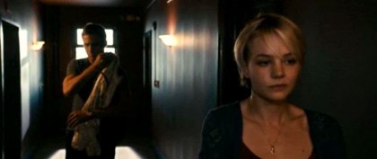 The Driver’s illegal escapades come as interludes in his career as a motor mechanic and part-time stunt driver for movie productions. All of these jobs are arranged by Shannon (Bryan Cranston), who confesses cheerfully to having been “exploiting” his quiet, pliable employee since he first walked in asking for a job five years earlier. Driver seems to regard Shannon as a fatherly figure. But Shannon has links to criminal entrepreneurs Bernie (Albert Brooks) and Nino (Ron Perlman), and he borrows money from the pair to buy a stock car that Driver will race. At the same time, Driver is drawn into the lives of Irene (Carey Mulligan) and her son Benicio (Kaden Leos) when they move into an apartment down the hall from his. As his path repeatedly crosses with theirs, Driver steps into the role of paternal pal for the boy and beneficent helpmate for Irene, even as he learns she’s still married to Benicio’s father Standard (Oscar Isaac), who’s serving a prison term. When Standard gets unexpectedly released, the Driver continues to stick close to the family in uneasy amity until, not surprisingly, Standard proves to have trailed a threat with him from prison, owing money to heavies who helped protect him in prison: Standard is beaten up by thugs, and Benicio is presented with a bullet. Driver confronts the battered father and finds he’s being pressured into taking part in a pawn shop robbery, so Driver decides to volunteer his services as the getaway driver for the job. He meets with Cook (James Biberi), the nominal planner of the heist, and Blanche (Christina Hendricks), who will accompany Standard on the actual robbery. But when the job goes down, Standard is shot dead, Blanche comes out with a sack of a million dollars, and Driver has to do what he does best in eluding a pursuing black car.