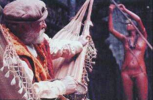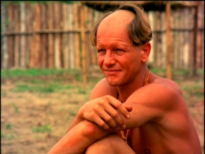 A French merchant (Manfredo Colassanti, Arduino’s father) comes to the village, and the French captive pleads with him to convince Cunhambebe that he is not Portuguese. The merchant says emphatically that he is Portuguese for reasons still obscure to me. He advises the captive to sit back and enjoy himself. He will be an honored guest for the next eight months, will have Seboipepe (Ana Maria Magalhaes), a woman presented to him on the first night of his capture, as a wife, and probably will escape. Slowly, the captive establishes a routine and quickly goes native, shedding his clothes, shaving the top of his head, and eventually fighting alongside the Tupinambas to defeat the Tupiniquins.