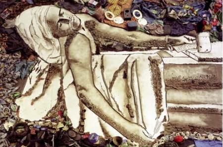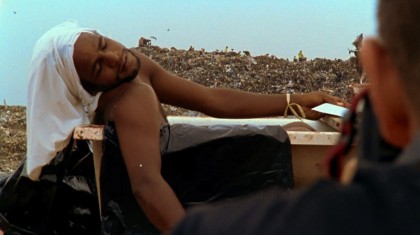 The most dynamic of the pickers is Tiao. He can read, and picked Machiavelli’s The Prince out of the garbage, which gave him the idea to organize the pickers union. Muniz, perhaps inspired by Tiao’s activism, decides to photograph him in imitation of David’s painting , and we watch as Tiao and Zumbi carry a discarded bathtub out of the piles of garbage and Tiao, guided by a picture of the painting, assumes the pose of the slain Marat.